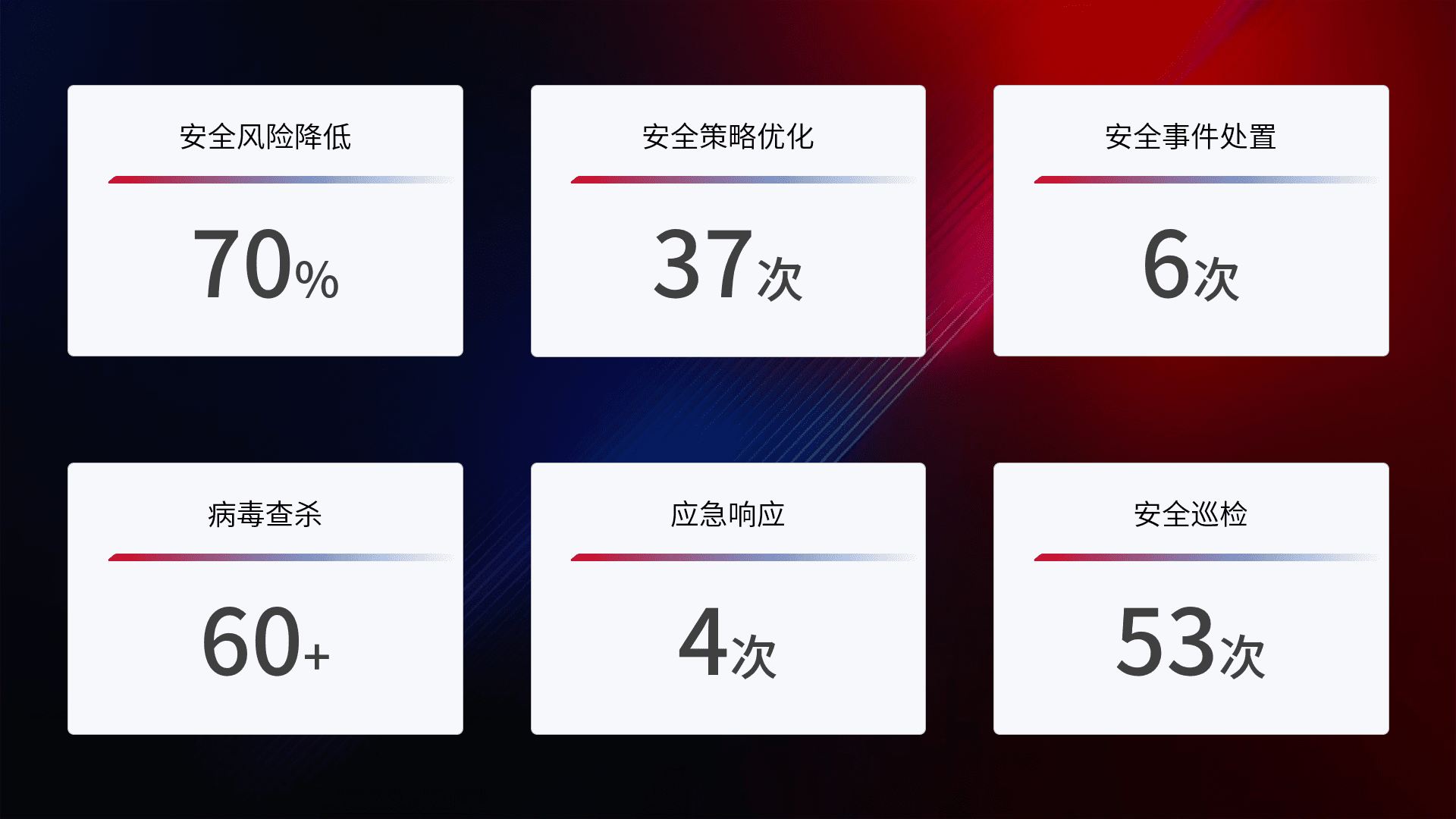 提供全面的安全事件报告体系,,,,包括处置报告、、、周报、、季度和年度总结,,结合持续监控,,帮助客户深入了解网络安全状况。。。