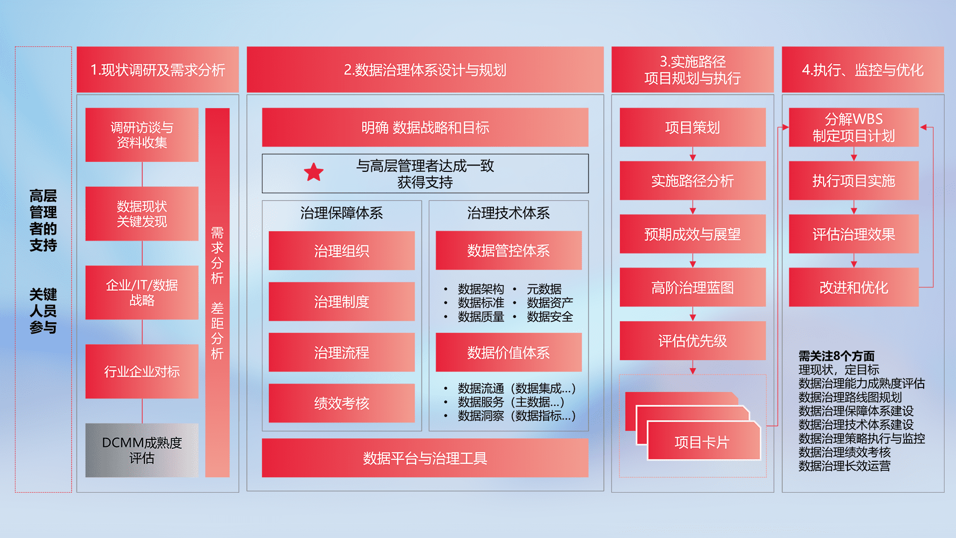 制定并执行统一的数据标准,,规范数据定义和格式,,,,消除冗余和不一致性,,,实现跨部门和跨系统的数据一致性,,,,为企业提供标准化的数据基础。。